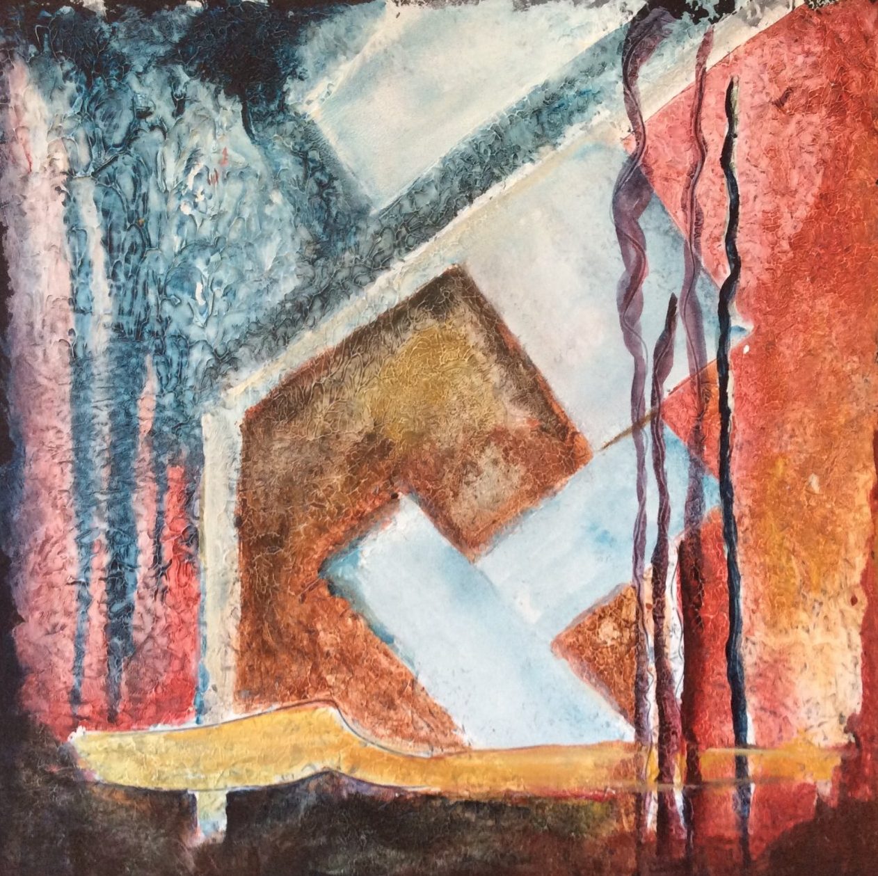 Abstract schilderij in verschillende technieken en materialen,in acryl uitgevoerd.