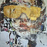 Modern abstract mixed media schilderij opgebouwd uit diverse lagen, dekkend en transparant en met verschillende materialen.